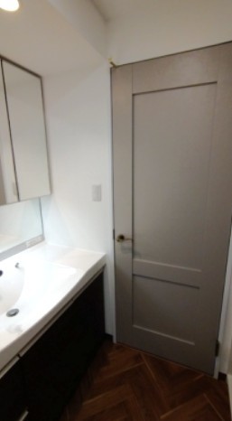 洗面化粧台は既存のものですが、お洒落なヘリンボーン柄の床や真っ白なクロスで印象ががらりと変わりました。
