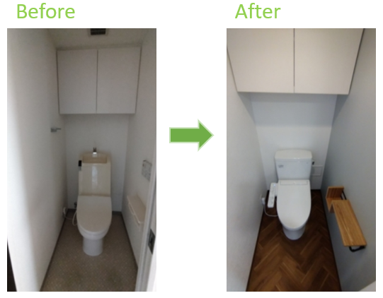 お掃除がしやすい、手洗い無しのトイレをお選びいただきました。 ペーパーホルダーはお客様にご用意いただき、ウッド調が可愛らしい空間になりました。