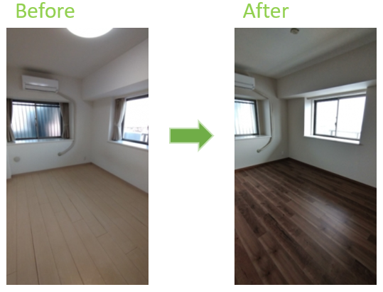 床の劣化が気になるとのことでしたので、床暖房に対応している上張り用フローリングを施工させていただきました。