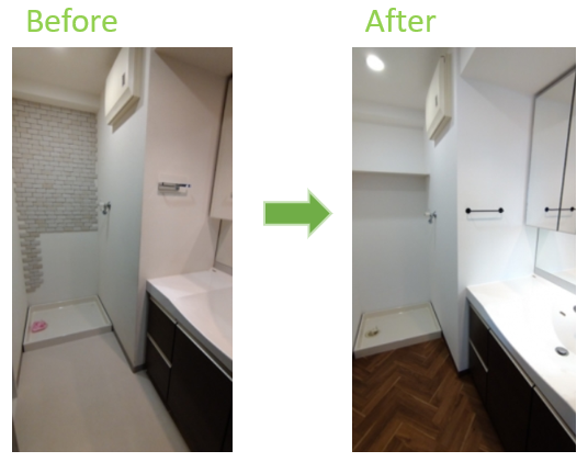 洗面化粧台は既存のものですが、お洒落なヘリンボーン柄の床や真っ白なクロスで印象ががらりと変わりました。