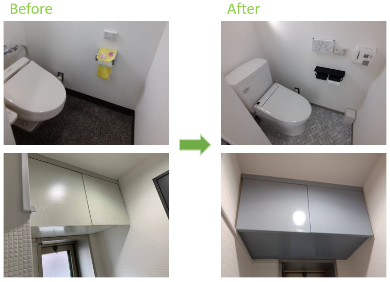 トイレはお手入れのしやすい手洗い無しのタイプをお選びいただきました。 内装材もグレートーンで統一し、明るい空間になりました。